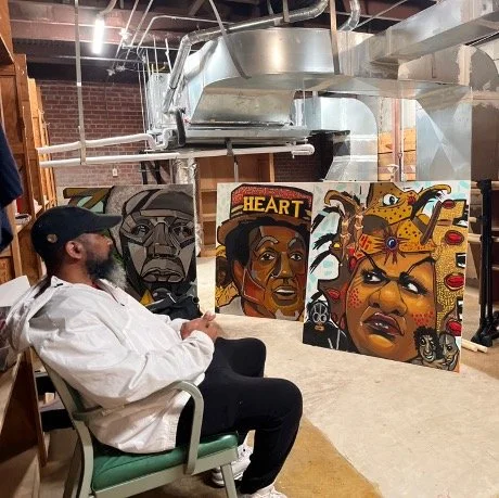Curtis “Bro. Boze” Riley, sitting with a few images from his earlier gallery exhibition, highlighting characters from "The Wiz."