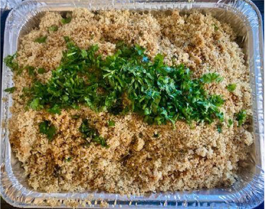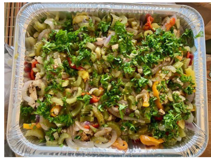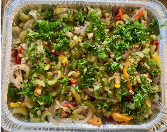 Baked marinated tofu with sauteed onions, celery, mixed peppers, onions, parsley and cilantro