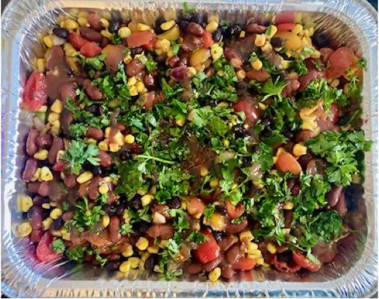 Bean salad with fresh heirloom tomatoes, black beans, kidney beans, corn, onions, assorted colored bell peppers, date & tamarind chutney, chili sweet & sour sauce