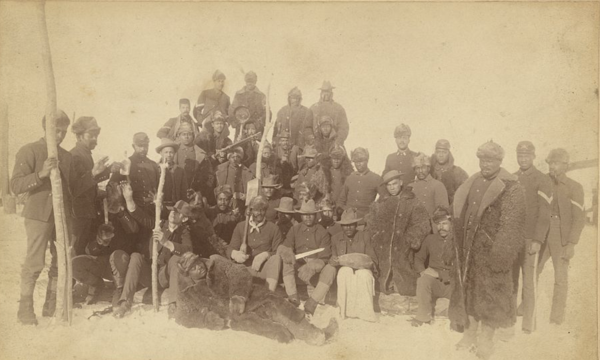 Buffalo soldiers of the 25th Infantry, some wearing buffalo robes, Ft. Keogh, Montana] / Chr. Barthelmess, photographer, Fort Keogh, Montana. Published 1890. Source: Library of Congress